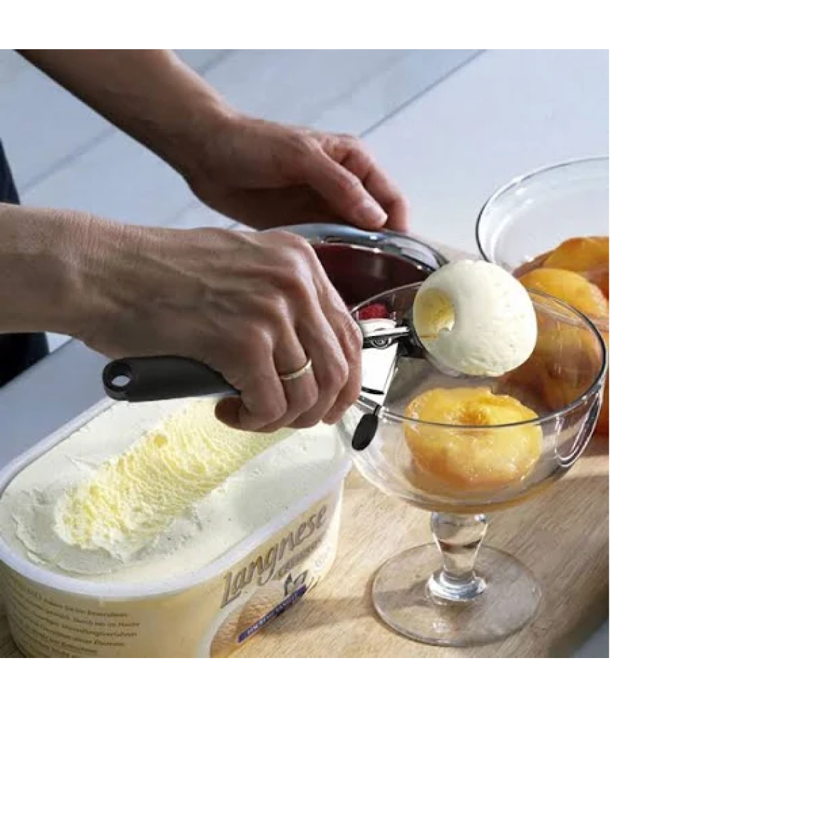 Seu design funcional inclui um mecanismo de ejeção que ajuda a liberar o sorvete da colher sem esforço,